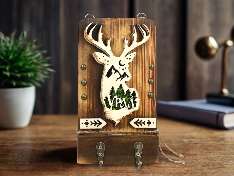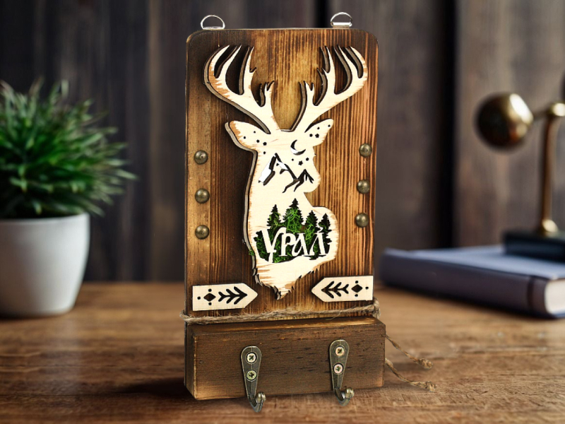 Ключница "Урал" с оленем (10*5*19) Дерево, с обжигом, оформл., 1шт.